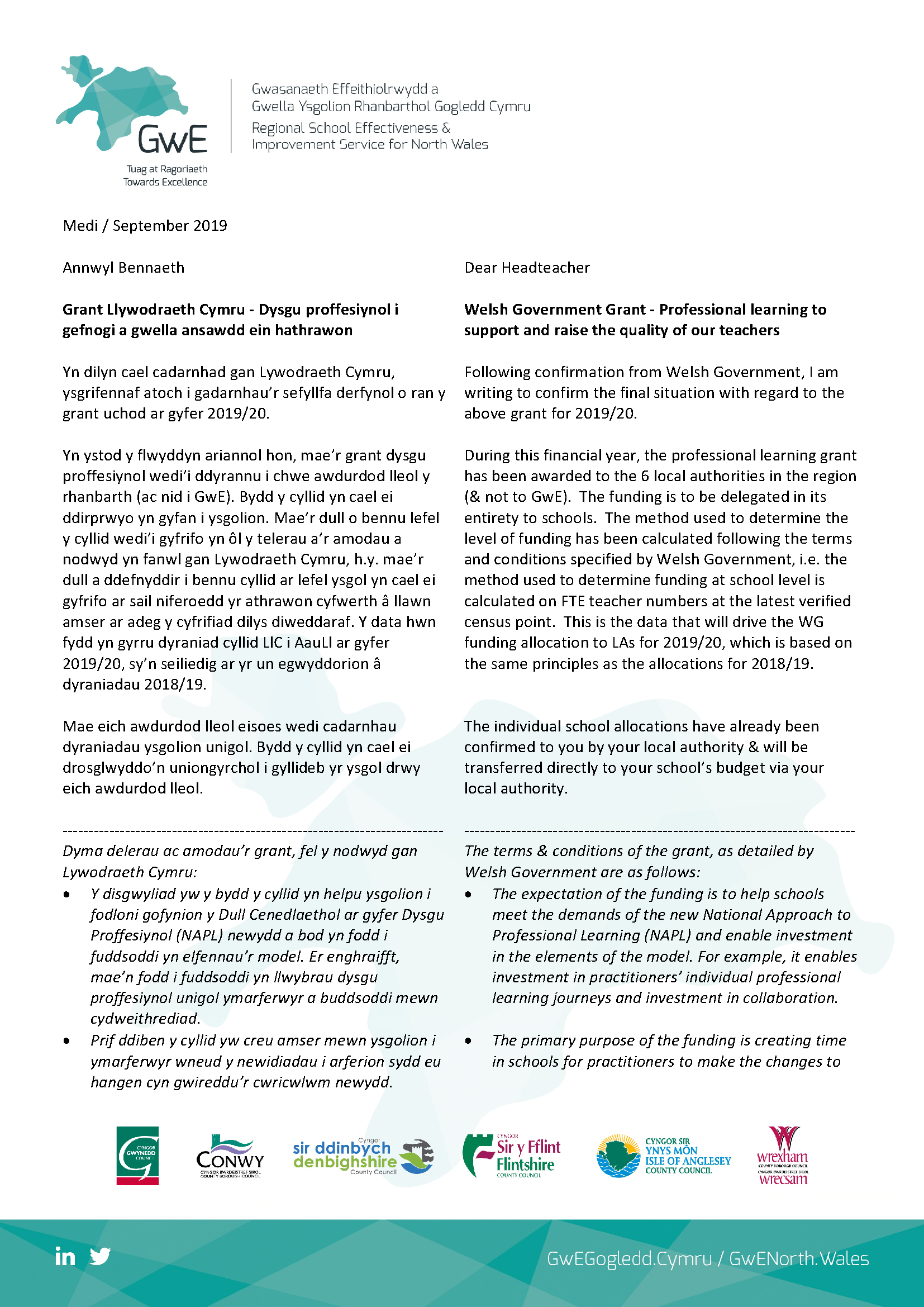 Yn ystod y flwyddyn ariannol hon, mae’r grant dysgu proffesiynol wedi’i ddyrannu i chwe awdurdod lleol y rhanbarth (ac nid i GwE). Bydd y cyllid yn cael ei ddirprwyo yn gyfan i ysgolion. Mae’r dull o bennu lefel y cyllid wedi’i gyfrifo yn ôl y telerau a’r amodau a nodwyd yn fanwl gan Lywodraeth Cymru, h.y. mae’r dull a ddefnyddir i bennu cyllid ar lefel ysgol yn cael ei gyfrifo ar sail niferoedd yr athrawon cyfwerth â llawn amser ar adeg y cyfrifiad dilys diweddaraf. Y data hwn fydd yn gyrru dyraniad cyllid LlC i AauLl ar gyfer 2019/20, sy’n seiliedig ar yr un egwyddorion â dyraniadau 2018/19.
